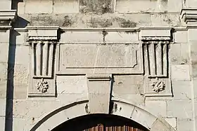 Logé entre la clé d'arc et l'entablement, un cartouche flanqué de triglyphes à motifs de gouttes est gravé d'un chronogramme qui date la réédification de la tour de 1715[2].