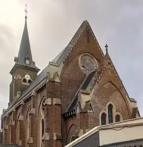 L'église à chevet plat, de style néo-gothique, est construite en brique. Un clocher-porche surmonté d'une flèche recouverte d'ardoises donne accès à une nef unique voûtée en bois. L'édifice conserve une chaire à prêcher et des statues de saints[1].