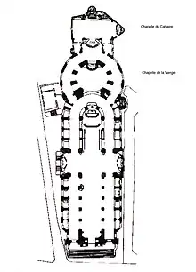 Du nord au sud, l'édifice présente une série de chapelles ou d'éléments architecturaux, dont les principaux sont évoqués ci-dessous.