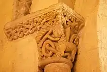 L'oiseau : Sur la corbeille, que tapisse un entrelacs stylisé de rameaux à grands feuillages, un oiseau, à gros bec, se tient tranquillement au repos. Ce chapiteau est peut-être authentique.