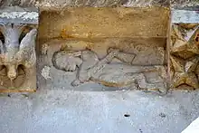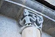 Toutes les sculptures[3] du chevet se trouvent sous la corniche : une vingtaine de modillons et quatre corbeilles sans tailloir.