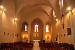 Le chœur est composé de trois chapelles dans l'alignement de la nef qui possèdent, chacune, des fenêtres gothiques qui abritent également des vitraux de la seconde moitié du XIXe siècle (1874, atelier Martin Avignon). Ces chapelles possèdent également des voûtes sur croisées d'ogives. La chapelle principale du chœur est plus basse que la nef (hauteur de sa voûte : 10,50 m). Elle est surmontée du haut mur de l'abside qui était percé, à l'origine, d'une rose aujourd'hui malheureusement bouchée, dont on devine encore la trace. Les deux chapelles qui l'encadrent sont encore un peu plus basses (hauteur de leurs voûtes : 8 m) ce qui donne, à l'extérieur, un élégant chevet plat à plusieurs décrochages de toitures.
