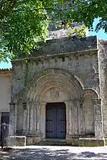 Le portail roman, ouvrant sur la façade occidentale, est encadré de six colonnes engagées, ornées de chapiteaux. Cinq d'entre eux sont romans. Le sixième, le plus au nord, a été ajouté avec sa colonnette lors de la restauration de 1855.