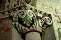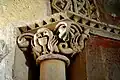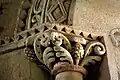 Les seuls chapiteaux romans conservés sont ceux de la baie axiale : des dragons, à têtes colombines, se désaltèrent à un calice au milieu des lianes grasses et feuillues.