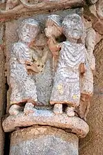 Cette console, au sud de la façade occidentale, est romane et truffée de symboles. Un couple constitué d'un homme et d'une femme nus, à demi allongés au-dessus du vide se tient dans l'ombre d'un arbre à fleur de lis. La main droite de l'homme touche les fesses de la femme. Sa main gauche tient une tige de l'arbre — les clercs romans raffolaient des jeux de mots et de calembours grivois et l'association : caulis = la tige et caulis = le pénis était très fréquente —. Après le plaisir charnel, le couple va choir au sol pour son péché. Assis derrière l'arbre, un personnage est en train de commenter un livre, sans doute la chute d'Adam.