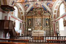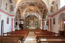 Le chœur, décoré par Joseph Dominique de la Valsesia en 1742, contient un grand retable et un autel. Les peintures des murs de l'autel représentent différents saints de l'église catholiques. Les voûtes de la nef sont peintes, elles comportent différentes peintures réalisées en 1843[4] qui ont remplacé les lambris initiaux de la nef.
