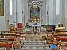 L'église a une seule nef. La façade principale est de style Renaissance.