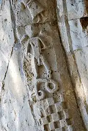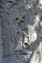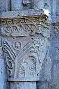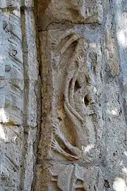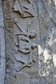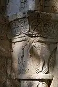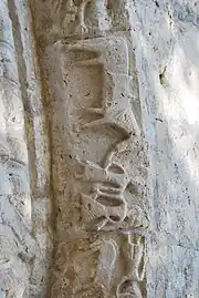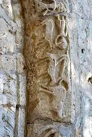Au début de l'arc, il y a des claveaux disparates, à décor d'entrelacs et damiers, sans aucun rapport avec l'histoire. Ils sont des pièces de rafistolage, insérées lors d'une réparation tardive.