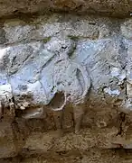 Deux animaux indéterminés, à croupe haute, aux pattes arrière allongées semblent combattre. Leurs longs cous sont entrelacés.