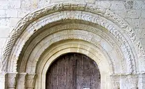 Le portail, à faible ébrasement, a quatre voussures : une fine voussure sur imposte et trois larges voussures en ressaut, qui retombent sur huit chapiteaux. Les voussures ont un décor riche et diversifié. La surface du répertoire ornemental (damiers, losanges, perles, etc.) est plus importante que celle du programme figuré.
