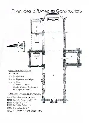 D’après Prarond, la date de la fondation de l’édifice n’est pas connue avec précision, l’église ayant été, en certains endroits, remaniée à différentes époques[7]. Il distingue au sein de l’édifice cinq parties distinctes, d'ouest en est :