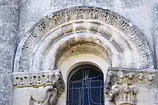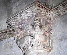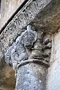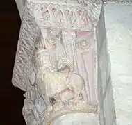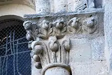 Six chapiteaux romans, dont deux sont historiés, soutiennent la corniche. Du sud au nord : feuillage d'acanthes, lions et dompteurs, acanthes, les quatre dogues, pignes, acanthes.