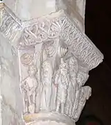 Sur les deux faces du tailloir, deux anges volent. Celui qui porte un livre montre du doigt l'étoile qui a guidé les Mages depuis l'Orient et qui est un emprunt de la Nativité décrite par Luc II, 7-20 et dans laquelle Jésus est placé dans une crèche avec des bergers pour compagnie.