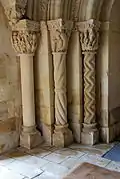 Les corbeilles des colonnettes de la première baie ont un décor uniquement végétal.