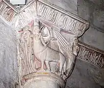 Le tailloir du chapiteau est orné d'une frise d'acanthe sèche. Sur la face principale de la corbeille, un ange nimbé est grimpé sur le dos d'un dragon ailé symbolisant le Diable. L'ange aux pieds nus enfonce un épieu dans la gueule du dragon.