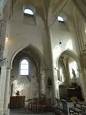 Les chapiteaux des grandes arcades sont sculptés de feuilles striées aux extrémités recourbées en bourgeons ou crochets, et sont conformes au courant général à l'époque de construction. Les tailloirs sont plus sommaires, et se résument à une plate-bande et un cavet, comme dans la nef. Les grandes arcades sont au profil d'un méplat entre deux tores dégagés, ce qui est le profil le plus courant à la première période gothique. Au-dessus des grandes arcades, suit une importante portion de murs aveugles, puis les fenêtres hautes, en plein cintre et à peine plus larges que les fenêtres bouchées de la nef. Selon Dominique Vermand, « l'architecte a délibérément recherché le contraste entre l'élévation des murs latéraux - caractérisée par une importante portion de maçonnerie au-dessus des grandes arcades et par la dimension volontairement restreinte des fenêtres - et celle du mur du chevet, ajouré d'une grande baie composée de deux lancettes surmontées d'une rosace ». Les auteurs n'indiquent malheureusement pas si celles-ci étaient aussi en plein cintre, ce qui est difficile à voir à travers la charpente du bas-côté nord. En tout cas, le plein cintre constitue un archaïsme au XIIIe siècle, qui apparaît également à Glaignes. La partie inférieure des fenêtres a été bouchée dans le contexte de l'exhaussement des toits en appentis des collatéraux. Au niveau de la retombée des hautes-voûtes, les piliers portent une frise de feuilles polylobées appliquées, et les chapiteaux des doubleaux sont sculptées de même. Cette sculpture est d'une facture presque rustique, nettement plus simple que celle des chapiteaux du premier niveau. Les tailloirs sont encore plus rudimentaires, et se limitent à une mince plate-bande et un biseau. Le doubleau est au même profil que les grandes arcades, et les ogives affichent un tore en forme d'amande entre deux gorges, qui le dégagent d'un bandeau en arrière-plan. Ce profil est commun à toutes les voûtes de l'église. Les clés de voûte ne sont pas décorées : les ogives s'y croisent simplement. C'est également le cas dans les collatéraux[4],[7].
