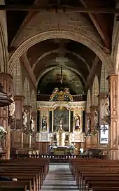 Le chœur présente une structure plus classique. Six arcs plein cintre portent une voûte de bois, en berceau, ornée de peintures ainsi que les écoinçons des arcades. Les chapelles, coiffées de demi-berceaux, sont séparées par des murs de refend percés de petites portes surbaissées. Seules les fenêtres ogivales attestent de l'origine gothique de cette partie de l'édifice terminée au XVIIIe siècle.