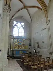 - Le vitrail du chevet du collatéral sud, représentant des scènes de la vie de Marie et de l'enfance du Christ sur un ensemble de trente médaillons. Ce vitrail est aussi ancien que l'église et date donc de la fin du XIIIe siècle. D'après la tradition locale, il aurait été offert par Blanche de Castille[47], qui est toutefois morte en 1252, bien avant le début de la construction de l'église.