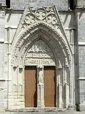 - Deux bas-reliefs en pierre jointifs encadrés de quadrilobes, représentant saint Sulpice guérissant les estropiés et datant du XIVe siècle[39]. Il se trouve au-dessus de l'entrée de la chapelle des Miracles, dans le collatéral nord.