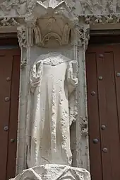 - Un bas-relief en pierre, représentant un évêque agenouillé, sans doute saint Sulpice, et datant du XIVe siècle. Il s'agit vraisemblablement d'un fragment de l'ancien maître-autel, qui a disparu. La colonnette à gauche de l'évêque donne à penser que le maître-autel était décoré d'arcatures de la même facture que sur les soubassements des fenêtres[40]. Le fragment se trouve au-dessus de l'entrée de la chapelle des Miracles, dans le collatéral nord.