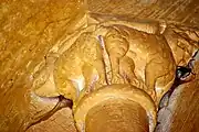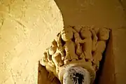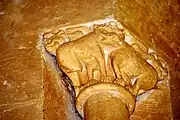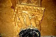 Les chapiteaux de la fenêtre sont sculptés avec un lion bicorporé à l'est et deux lions adossés à l'ouest. La sculpture du chapiteau de l'arcature occidentale est symétrique. Au centre de la face principale, un masque de démon. Sous le masque, deux énormes volatiles sont dos-à-dos. Sur chaque angle de la corbeille, un homme debout, habillé d'une tunique longue, a saisi le cou de l'oiseau qui lui picore l'oreille. Sur chacune des petites faces se trouve un autre oiseau, avec son cou saisi par l'autre main de l'homme.