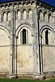 L'abside présente sept pans : deux forment l'avant-chœur ; deux latéraux courts pour le chœur et trois fermant l'abside, composent le chœur en hémicycle. Chaque pan est séparé par des contreforts-colonnes cannelés à leur partie supérieure, dont le diamètre décroît de bas en haut, changeant quatre fois de diamètre. Ces colonnes, partant du sol où leurs bases s'appuient sur une banquette, montent jusqu'à la corniche qui supporte le toit. Les chapiteaux portent tous un décor végétal. Cette disposition, de « colonnes télescopiques », se rencontre dans d'autres églises de Saintonge, en particulier à l'église Notre-Dame de Rioux.