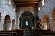 C'est une église de plan basilical dont les trois nefs charpentées et la tour porche datent du XIIe siècle. Les trois absides du chœur sont d’époques différentes (gothique au nord, du XIXe siècle pour les autres). La nef romane se compose de cinq travées ouvertes sur les bas-côtés par des arcs en plein cintre qui reposent sur des piliers en pierre de taille. Ceux-ci, carrés à l’origine, ont vu leurs angles abattus (retaillés) pour leur donner une section octogonale.