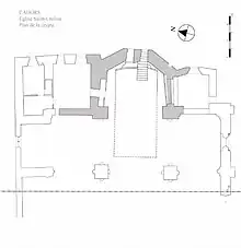 En attendant le futur déblayage, la description de la crypte de Daymard peut nous donner une idée complémentaire. « Elle a une longueur Est-Ouest de 11 mètres, une largeur de 5 mètres et une hauteur sous-clef de 3 mètres. La voûte, en berceau, paraît avoir été faite en deux parties à peu près égales, celle de l’est, en plein cintre, celle de l’ouest, avec une courbe un peu brisée. Dans l’angle nord-ouest est l’escalier qui conduisait dans l’église supérieure et s’ouvrait à côté du pilier qui est en face de la chaire[18] ».