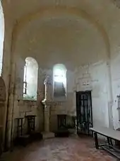 Comme fréquemment, un décrochement existe entre la voûte en berceau de la première travée et le cul-de-four de l'abside, dont la largeur est légèrement plus réduite. Dans les angles rentrants ainsi créés, sont logées deux colonnettes appareillées, dont les chapiteaux aux volutes d'angle ou de palmettes ne font qu'un avec les tailloirs, qui supportent un arc-doubleau à l'arête moulurée en quart-de-rond : il n'y a qu'une seule arête et l'on n'a pas opté pour un tore, car à l'arrière, le doubleau dissimule le décrochement signalé. La partie basse de la colonnette de droite a été supprimée sans motif apparent. Au niveau des tailloirs des chapiteaux, un bandeau court autour de l'abside, servant d'appui au rang de claveaux inférieur du cul-de-four. Il est interrompu par les fenêtres, qui sont au nombre de deux : une dans l'axe et une au nord-est. Une troisième baie existait au sud-est malgré la proximité du chœur. Elle a été entièrement murée lors de l'adjonction de la sacristie, dont la deuxième porte (la première se trouvant dans le chœur) se trouve justement à droite de la baie d'axe. La sacristie obture également la partie basse de la fenêtre d'axe, qui présente un glacis étrangement long, alors que la baie de gauche en est dépourvue. La colonne entre les deux fenêtres était initialement destinée à la statue de la Vierge, qui est aujourd'hui abritée dans la niche formée par l'ancienne baie de la base du clocher. Elle porte actuellement une statue de saint Joseph, contrairement au titre initial de la chapelle[15].