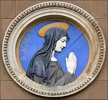 La façade comporte deux tours de 50 mètres de haut avec des flèches coniques. Il y a trois entrées avec des portails en grès. Ils sont décorés de trois reliefs en majolique italienne aux couleurs vives, réalisés à Florence à partir de modèles de Ludvík Šimek[5] : dans le tympan de l'entrée principale, il s'agit d'un relief de lunette avec une demi-figure de Saint-Pierre. Venceslas parmi les anges, au-dessus des entrées latérales reliefs circulaires (appelés tondo) d'Agnès de la Česká et Groznaty d'Ovence. La fenêtre ronde au-dessus du portail est ornée d'un vitrail avec une demi-figure de la Vierge Marie et de Jésus-Christ, visible uniquement de l'intérieur.