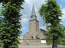 L'édifice bâti principalement en moellons de grès se compose d'une triple nef de quatre travées avec arcades aveugles encerclant les baies et un chevet à trois pans coupés. La tour est coiffée d'une toiture en ardoises à deux niveaux octogonaux à base concave avec abat-son et flèche surmontée d'une croix en fer forgé. Une chapelle a été ajoutée au XVIe siècle en prolongement de la nef sud[1].