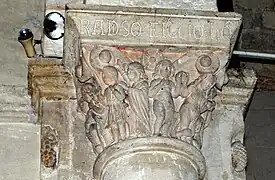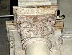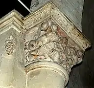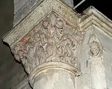 - Chapiteau 5 La corbeille est sculptée sur les trois faces. Chaque dé est supporté par la tête allongée d'un homme. Aux angles pendent deux reliefs ovoïdes, peut-être des pignes.