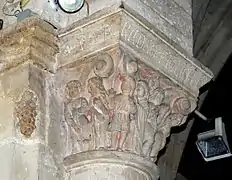 - Les seuls vestiges de l'église romane à l'intérieur sont les chapiteaux et les socles des colonnes qui encadrent les cinq baies de l'abside. La décoration des chapiteaux est très simple : entrelacs et feuillage.