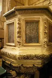 - Une chaire, provenant de l'ancienne église Saint-Projet de Bordeaux lors de sa démolition partielle, est venue enrichir l'église Saint-Vincent au début du XIXe siècle. Une inscription, placée sous la cuve de pierre hexagonale, indique clairement son origine et on peut la dater grâce à des documents, conservés aux Archives Départementales de la Gironde, précisant que le sculpteur Andron obtint la somme de quatre-vingt-dix livres le d'un certain Monsieur Dallon pour « l'esculpture » de la « chère » du prédicateur de Saint-Projet. Le de la même année, Pierre Berquin reçut la somme de soixante-cinq livres pour le dais (abat-voix) (aujourd'hui disparu).