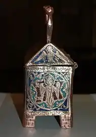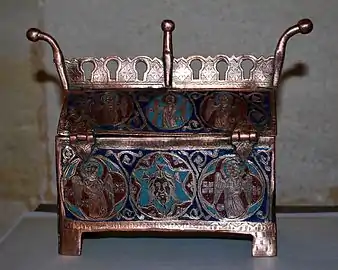 - Par son style, ce coffret se rattache aux productions des ateliers de Limoges où s'était perfectionné de très longue date le savoir-faire des enlumineurs, imagiers et émailleurs, maîtres de cet art du feu complexe et délicat. L'atelier de cet art limousin fut marqué de façon décisive par une innovation introduite au XIIIe siècle : les orfèvres parvinrent à émailler les fonds en épargnant les figures gravées dans le cuivre comme c'est le cas ici. La richesse et la variété des minéraux extraits du vieux massif limousin firent merveille… La nouvelle technique permit une fabrication largement consacrée à des sujets religieux. La situation de Limoges sur l'un des grands itinéraires du pèlerinage à Saint-Jacques de Compostelle favorisa la diffusion des œuvres produites qu'on retrouve en de nombreux lieux de culte.