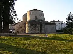 Deux portes plus basses et décalées sont de chaque côté de la façade. Une chapelle latérale fait office de baptistère.