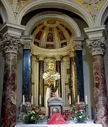 Sur cette façade à la couleur plutôt sombre, Carimini a conservé une note de couleur qui attire le regard. Contrairement à ce qu'indique l'ouvrage de Pierre Lacroix[14], prétendant que le médaillon de la Vierge est une copie fort réussie d'un Della Robbia, il semble bien que le médaillon soit un réemploi de l'ancienne église sorti tout droit des ateliers des frères Della Robbia ou tout au moins de leurs disciples»[15]. En 1878, Adriano Ferraresi (1851-1892) compléta ce médaillon de deux figures, l'une de saint Yves à gauche, l'autre de Saint Bernard. La Famille Della Robbia est une famille d'artistes italiens de Florence bien connus depuis le XIVe siècle. Parmi les membres les plus célèbres de cette famille, Luca Della Robbia (1400-1481) et Andrea Della Robbia (1435-1525) son neveu. Luca est celui qui fonda les ateliers d'où sortirent de nombreuses œuvres que l'on retrouve à Florence, à Rome et Naples.
