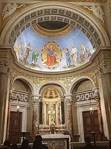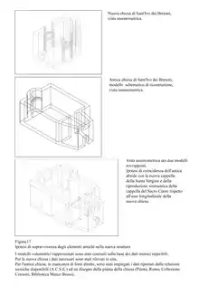L'hypothèse[12] que des éléments en maçonnerie de l'ancienne église ont été conservés dans le nouvel ensemble (les bâtiments plus la nouvelle église) est fondée. L'emplacement de l'ancienne abside coïnciderait avec l'actuelle chapelle de la Sainte Vierge. Des considérations à l'appui de cette hypothèse concernent la forme de la nouvelle église. La persistance de la structure maçonnée de l'abside, avec ses proportions, en aurait affecté le plan et le développement en élévation. La rotation de 90 ° de l'axe de l'église (nécessaire pour l'obtention d'un bâtiment plus petit dans le même lot), aurait exigé la construction d'une chapelle symétrique et grande d'autant.