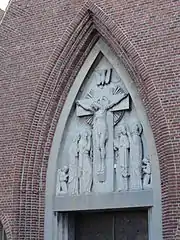 L'église de briques présente une voûte à vaisseau renversé et un clocher (béni en 1956) s'élève à gauche de la façade, tandis qu'une petite tourelle aveugle à droite est surmontée d'une flèche de pierre. La façade est éclairée dans sa partie basse de deux paires de fenêtres ogivales. Le tympan ogival est orné d'un grand bas-relief de la scène de la Crucixion en pierre.