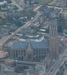 L'église est construite dans le style gothique tardif. Il s'agit en fait d'un mélange de gothique campinois et de gothique brabançon, d'après les plans de l'architecte Rombout II Keldermans (mort en 1531). La tour mesure 104,7 mètres de haut et est carrée à la base. Cela correspond à environ 150 coudées brabançonnes car le mètre n'existait pas encore au XVIe siècle. La base du clocher est quadrangulaire et se fond en un cierge octogonal, un bulbe couvert d'ardoises[1],[2].