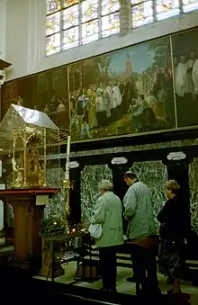 Après la reconstruction de l'église dans les années cinquante, des candidats vitriers sont sollicités en 1963 pour combler les places vides. Jan Huet et Marc de Groot envoient leurs créations. En 1974, Jan Huet se voit attribuer huit nouveaux vitraux dans la partie avant de l'église, tandis que Marc De Groot est autorisé à placer douze vitraux, les paraboles et les miracles, dans les bas-côtés. Malheureusement, Jan Huet décède le 2 avril 1976, après quoi son élève Jan Willemen de Dongen aux Pays-Bas se voit confier les travaux. Le grand vitrail au-dessus du portail, "Le Retable de Gand", est également de sa main. La fabrique d'église veut une référence au Retable de Gand des frères de Eyck, qui est aussi une référence à la Vénération du Saint-Sang. Lorsque le prêtre lève les yeux pendant l'Eucharistie, il regarde vers le vitrail et fait référence au texte : "Voici l'Agneau de Dieu, qui ôte les péchés du monde" (Jean, I, 29-36)[14].