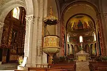 La croisée du transept est couverte d'une coupole centrale byzantine, enveloppée extérieurement d'un tambour cylindrique. Le bras nord du transept est surmonté d'un clocher.