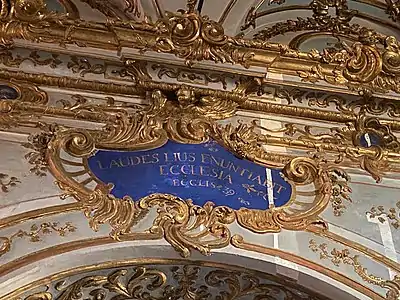Dans l'oratoire, l'ornementation foisonne : feuillages, guirlandes de fleurs, coquillages recouvrent les murs et la voûte.