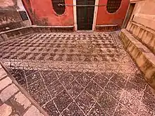 Jadis il faut s'imaginer qu'un gros rocher occupait le parvis de la façade principale. En 1818 le rocher est complètement rasé et on réalise une mosaïque avec des galets rapportés de la plage de Miomu, au début du Cap Corse. C'est une tradition génoise que l'on retrouve à Bastia dans le parvis de l'oratoire de l'Immaculée-Conception[3].
