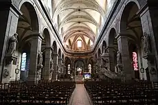 Statues sur les piliers et chaire offerte par Napoléon III. Maître autel en marbre.
