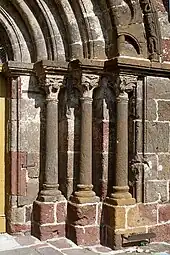Ce portail, surmonté d'un puissant arc de décharge, est encadré de deux groupes de trois colonnes présentant un anneau torique à la base et surmontées chacune d'un chapiteau sculpté. Ces colonnes supportent une archivolte à voussures multiples dont la dernière est ornée de lobes et d'une moulure décorée de personnages et d'animaux.