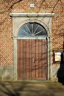 À l'ouest, l'église présente une tour carrée de style classique[1] cantonnée de puissants chaînages d'angle en pierre bleue. Au rez-de-chaussée, la tour est percée d'un portail de style classique aux piédroits moulurés dont les impostes portent un arc en plein cintre dont la clé est orné d'une marguerite. Cet arc mouluré, dont les écoinçons affichent le millésime de 1784[1], encadre une fenêtre d'imposte au motif rayonnant et est surmonté d'un petit entablement.
