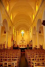 L'église possède un intérieur composé de trois nefs de cinq travées[1],[3]. Cet intérieur est peint en jaune pâle, sauf les arcs, nervures, corniches, cartouches et chapiteaux qui sont peints en blanc, les verrières jaunes[1] renforçant encore la teinte dominante de l'ensemble.