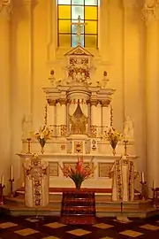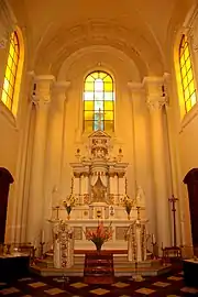 Le maître-autel blanc et or, d'un goût plus baroque que néo-classique, est couronné d'un pignon à volutes sommé d'un fronton triangulaire et flanqué de pots à feu. Le crucifix qu'il porte trouve un écho dans le vitrail jaune et blanc qui clôt la perspective de l'église.