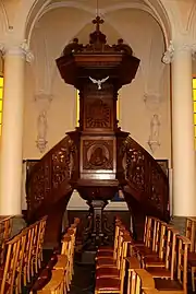 La nef est séparée des collatéraux par des arcs cintrés portés par des colonnes au fût lisse, surmontées de chapiteaux ioniques. Elle possède une belle chaire de vérité.